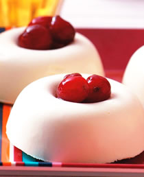 4.自冷库室取出作法3,一一将成品倒扣出来,于凹口处放入新鲜蔓越莓果,再刷上少许镜面果胶即完成。