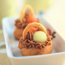 6.取适量咖啡布丁馅填入做为花篮的泡芙中,将哈密瓜果肉用挖球器挖成球状,放在布丁馅上。