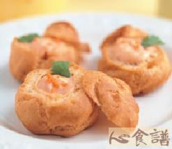 5.将冷却后的泡芙从1/3处切开,放入烫熟后剥壳的虾子。