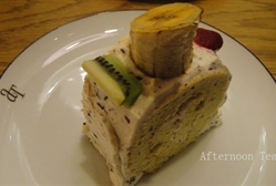 特制杏仁海绵蛋糕1片,杏仁巧克力鲜奶油300公克,香蕉2条,奇异果1又1/2个,300公克,烤香蕉1条,奇异果2/3个,水蜜桃2/3个,薄荷叶少许,果胶少许