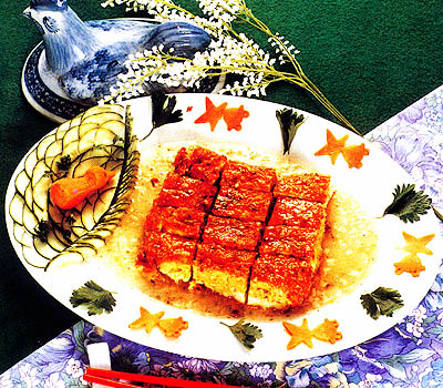 3、将油锅里的生油烧热,把鸡肉放进油锅中炸至金黄色(要注意炸熟),捞起切成3厘米块状,用薄淀粉勾芡放进盘底(玻璃芡),再将鸡肉放上即成。