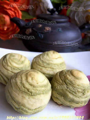 我做芋头酥基本按这个方子做的,做绿茶酥时在油酥里加入了少许的绿茶粉,馅心是用莲蓉包的!