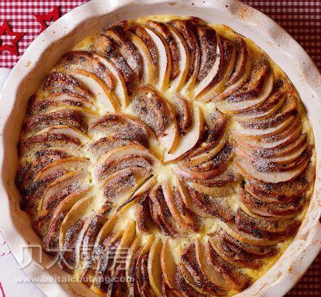 将苹果片和干果面包片相互交错地码放到圆形烤盘模具中,上面浇上做好的奶汁。