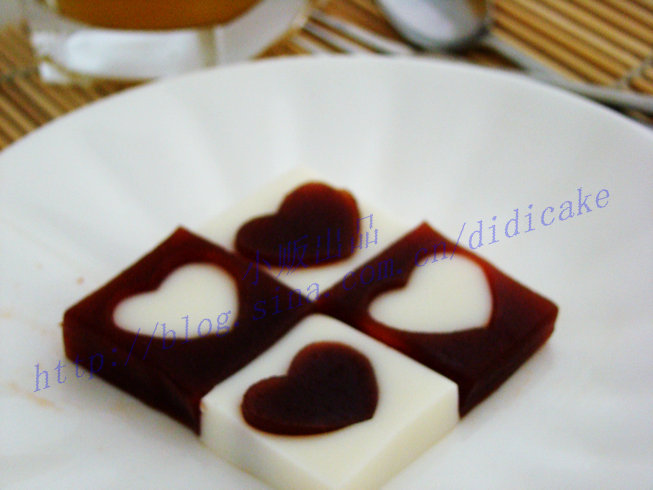 •5. 将牛奶布丁切成同山楂糕一样大小的方块,再用模子刻出心形,接着将山楂糕刻出的心形放入牛奶布丁的方块中,将牛奶布丁刻出的心形放入山楂糕的方块中。