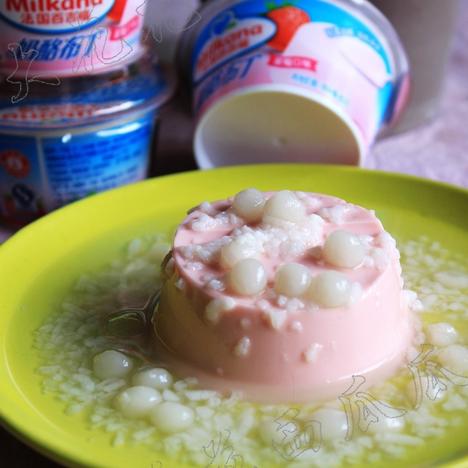 6、待醪糟冷却后,捞出小汤圆放到醪糟汤中。最后浇在布丁上即可。