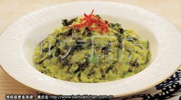 4.往蚕豆泥中加少许高汤,拌匀,放入雪菜,调入白糖,改大火煮沸,略收汁即可。