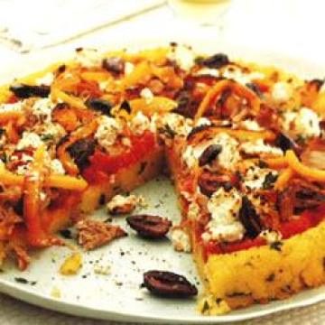即食玉米(粟米)粉(polenta)340克,切碎的新鲜百里香1汤匙,切碎的荷兰芹(洋香菜)3汤匙,特纯橄榄油1汤匙,西红柿1罐(约410克),切碎,烤过的黄甜椒1个,对半切开后去籽切条,水渍鲔鱼(吞拿鱼、金枪鱼)1罐(约185克),沥干后剥成小片,乳清(ricotta)奶酪1盒(约225克),黑橄榄12颗,去核后切半,新鲜百里香叶1至2茶匙,装饰用
