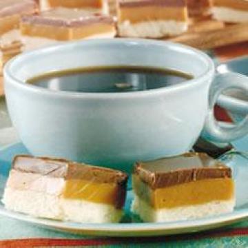 4.把巧克力放在微波炉盒子里。在微波炉里加热1分钟,然后拿出来搅拌,再加热20秒再搅拌,直到巧克力完全融化。把融化了的巧克力倒在黄油红糖混合物上,再均匀的抹平表面。冷冻。最后切成2厘米见方的小块。因为比较甜腻,所以一定要切得比较小。
