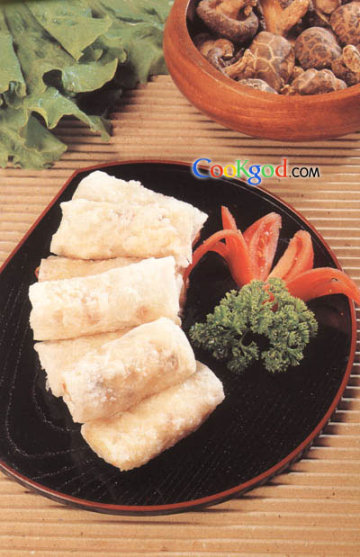 菜 名:酥炸纸包豆腐主 料:威化纸8至10块,板豆腐3件,虾仁2两(80克),叉烧2两(80克),冬菇3只,葱1条,生粉1/4杯。配 料:调味料:盐1/4茶匙,鸡粉1茶匙,麻油、糖各1/2茶匙,胡椒粉少许,生粉3汤匙。做 法:1、板豆腐冲净,隔干水搅烂;虾仁去黑肠,冲洗净抹干,用刀压成虾胶;叉烧切碎,冬菇浸透切碎,葱切粒。2、把全部材料放大碗内拌匀,加调味料搅至有黏性,放在扫有油的碟内拨平,蒸10分钟,取出待冷,切条,粘些生粉,用威化纸包好,在面上再粘些生粉。3、烧热3杯油,将纸包豆腐放油内炸至酥脆,取出,滤净油分,排放碟内,可蘸淮盐或辣椒酱同食。备 注: