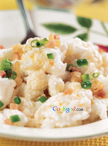 4.热少许油,爆香大蒜末与海米,再加入香葱花及火腿末,加精盐调味,最后淋上辣椒油即可铲起铺在做好的蛋清上。