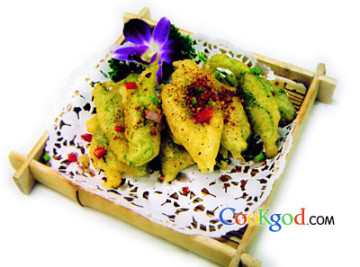 主料:革命菜500克,美玫粉(美玫粉是一种低筋面粉,也可以用其他面粉代替)500克,河虾仁250克。调料:姜汁酒10克,白胡椒粉2克,盐3克,鸡精7克,香油10克,色拉油750克,鸡蛋液4只。