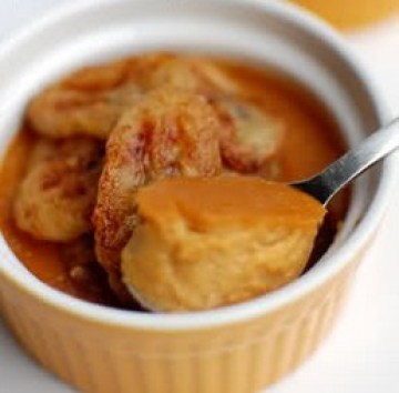 5、香蕉去皮后切斜片。黄油放入不粘锅中化开,火可以开大些但要注意别把黄油烧焦了,放入香蕉片,翻面使两面都粘上黄油,洒上一层糖,再翻个面,两面都煎成金黄色就好了。用厨房用纸吸去多余的黄油后放若干片在布丁上。