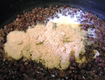 2) 乘热加入椰浆、红糖、干果拌匀,再加入糯米粉及少量淀粉,搅拌成粘稠状。