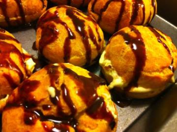 4.将作法2的面煳装入挤花袋中,挤在作法3的烤盘上呈一个个圆型状,在表面用喷水器喷上少许的水,入烤箱中以上火180℃╱下火180℃,烘焙约30分钟至泡芙表面无油泡,裂缝呈金黄色即可取出,待凉备用。