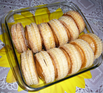 3、和好的面无需醒发,直接包入油酥用大包酥的方法制作。经过三折三擀,用模具切出形状,也可以用刀切出喜欢的形状。两个一组,取一片刷上蛋液,中间放上馅料(我用的蜜红豆),再放上另一片,用小一号的模具压实防止开裂。
