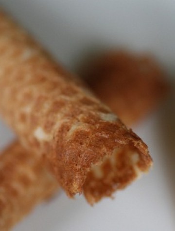 3、烤好以后取出来,稍稍等一会儿迅速卷成圆形,卷的时候不太好卷,可以用一个圆形勺子把什么的帮助你卷。尽量抹薄一些,这样更加酥脆。