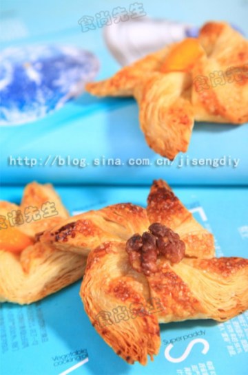 8.将7折叠成风车型,在表面刷上蛋液,然后中间放上一粒核桃摆盘