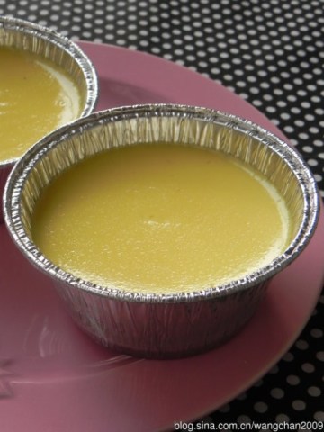 4.将模子放在烤盘内,然后在烤盘中注入2.5厘米深的热开水,烘焙30至35分钟,至布丁烤熟,即可享用。