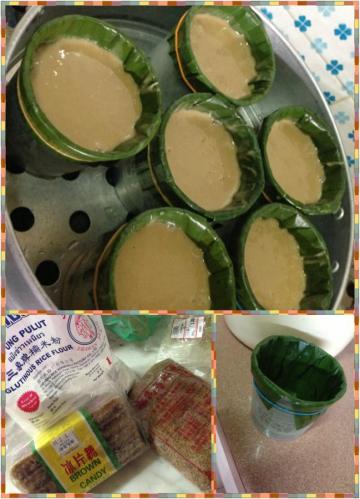 把brown suger, 片糖和水,用慢火煮至融化待凉了,就把糯米粉加入,搅拌到均匀,装入蒸碗/小盒子,然后用饭锅蒸三个小时(在三个小时之间记得要在锅内加水哦!)