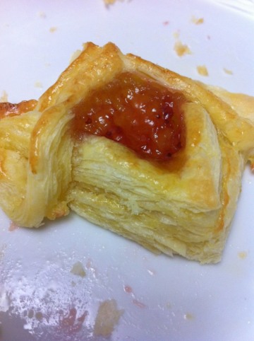 水,糖、少量盐,低筋面粉220g,黄油40g,黄油180g(裹入用),果酱