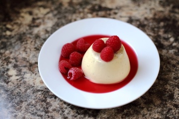 7、将奶冻脱模以后加上果汁再配上新鲜的覆盆子即可开动啦!