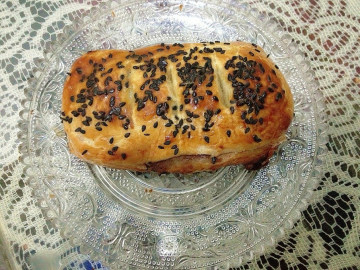 6、以小刀在派上划几道,抹上蛋液(烤出来会酥黄酥黄的),撒上芝麻。