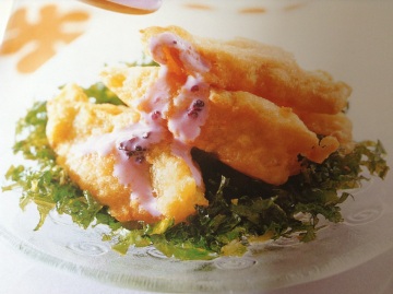 3、南瓜蘸上面糊,放入热油锅炸熟,放在时令蔬菜上,食用时搭配桑葚酱即可。
