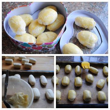 3、将面团下成小剂,按扁,包入榴莲肉,刷上一层鸡蛋黄,放入烤炉烤至金黄色熟即可。