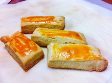 6、预热好,把面饼拿出切成合适大小,刷上蛋黄,180度烤15分钟即可。
