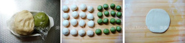 11.切面朝上压扁擀圆,翻面包入绿色豆沙馅