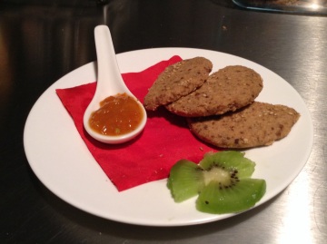 把所有食材拌匀,揉成团。分成小剂子在烤盘上用手掌压扁,或用饼干磨具压制成型。应该正好摆满一烤盘,撒些芝麻会更香。烤箱预热150度,烤20分钟。
