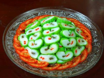 3、枸杞洗净,缀在其上,入笼蒸半小时成熟取出晾凉,切成薄片,造型摆入盘内。