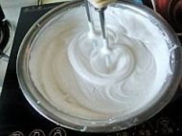 5、在第4步之后打了大约10分钟,试着用打蛋器将你打的蛋清挑起,如果蛋清能够立起来就说明你的奶油已经打好了。