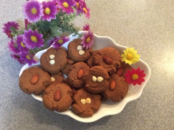 1.奶油280公克,糖粉250公克,2.蛋120公克,3.低筋面粉500公克,可可粉50公克,5.杏仁片140公克,小苏打0.25公克