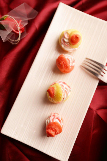 8、挤入卡士达酱,或用小裱花嘴花嘴在泡芙底部挤入也可。