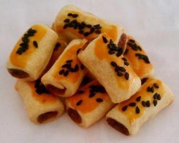 5.将作法4桿成长方形,包入作法1的一份馅料捲起,刷上蜂蜜酱汁,切成若干个小方块,再放入烤箱中层,以210℃烘烤10∼15分钟即可。烘烤即可。