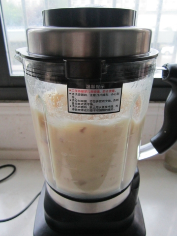 2、食材用燃气灶煮开烧2分钟后关火,放凉,温度30度左右时放破壁机内。