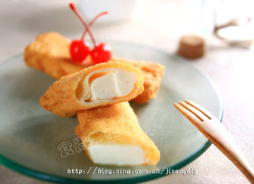 8.往锅中倒入7分满的油加热至200度,放入牛奶卷,炸至表皮酥脆后捞出沥油,切块。食用时配上樱桃美味更佳