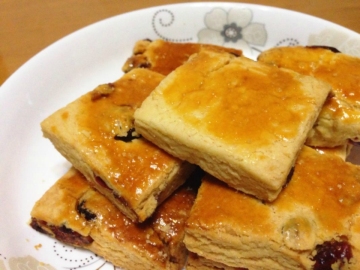 黄油80g,细砂糖50g,奶粉12g,蛋黄3个,低粉180g,蔓越莓干60g