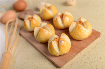12.包好的生胚用刷子在表面刷上蛋黄液,待蛋黄液干后用刀在生胚表面划十字,切到馅料处。烤箱预热185度,中层上下火约30分钟。烤至表面层次盛开,颜色金黄即可