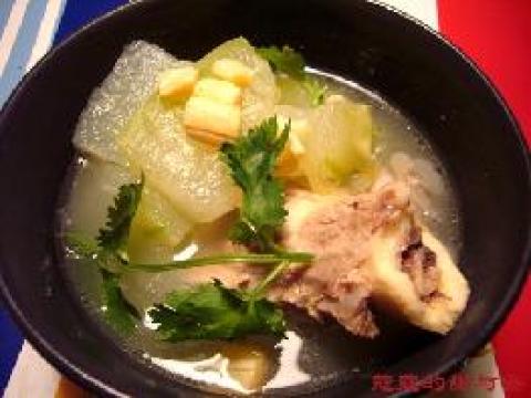 4.冬瓜去皮去软芯,切成大块,棒骨汤临关火前20分钟放入,喜欢吃脆口感的可以再晚点放。