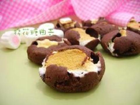 低粉130g,可可粉15g,苏打粉1/4勺,红糖60g,黄油70g,鸡蛋清一个,朗姆酒1小勺,小棉花糖适量