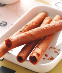 5.于蛋捲模上放约50公克的作法3拿铁咖啡蛋捲煳,盖上上盖约20秒后,翻锅面再10秒,再翻回来烤20秒,打开上盖,以铁捲棒和手辅助蛋捲捲起,即完成一支拿铁咖啡蛋捲。