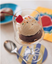 (2)接着排上1片巧克力派,再排上1∼2球冰淇淋,杯子容量足够的话,可再摆上1片巧克力派,再排上1球冰淇淋。