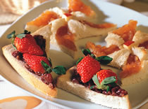 2.土司去边,抹上少许奶油,先涂满作法1中的苹果酱,然后在四个对角与中心点之间2/3距离处切开,摺成风车状,中间以手指按压帮助固定。