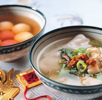 3.将红、白汤圆放入滚水中煮至浮起,材料4另外煮滚,吃的时候把汤圆放入碗中,再舀入糖水即完成甜汤圆。