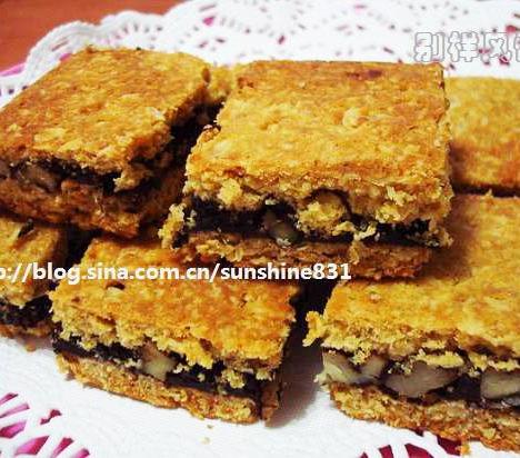 原方子:饼皮:无盐黄油120g,金砂糖50g,香草精1/2小匙,全蛋30g,低粉200g,燕麦片30g,内馅:核桃80g,牛奶45g,苦甜巧克力125g,我做的改动:饼皮:无盐黄油80g,细砂糖+红糖混合50g,鸡蛋一个,低粉110g,燕麦片110g。,内馅相同(黄油量减少;低粉量减少,燕麦片增加,二者达到1:1的比例;无香草精)