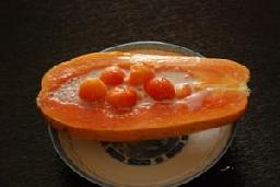4、木瓜中间剖开去籽,一边用取球器取成球状,放入另一边木瓜中间。