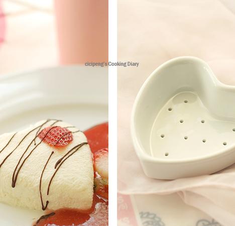 5、吃的时候倒扣到盘子里,轻轻取下纱布。一般配合fruitcoulis果泥一起吃,或者冷冻水果沙冰sorbet。果泥我用了草莓果泥,和做好的糖浆,这些东西都是冰箱里有什么拿什么啦没有什么特别,浆果啦蜜桃啦,芒果啦,都可以的。