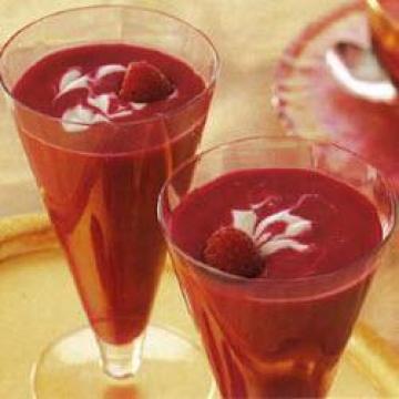 熟甜菜根2个(约130克),置凉后切块,新鲜或冰冻覆盆子(悬钩子,raspberry)55克,蔓越橘(cranberry)汁240毫升,冷藏,低脂原味酸奶(酸奶酪、酸奶)240毫升,装饰用的冷藏新鲜覆盆子(可选)